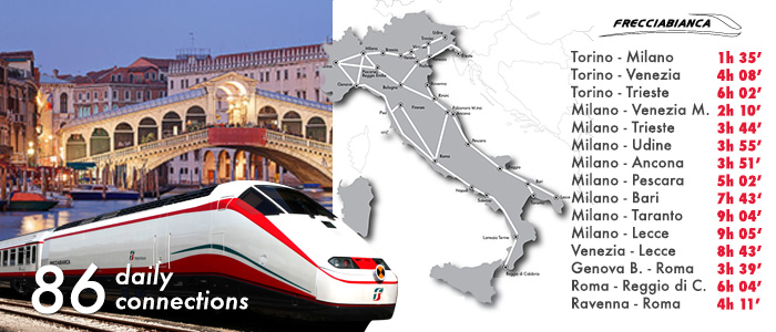 Основу высокоскоростной сети Trenitalia составляют линии: Frecciarossa, Frecciargento, Frecciabianca, предлагающие обслуживание в 1 и 2 классах. Также доступны менее скоростные региональные поезда, электрички и ночные поезда.